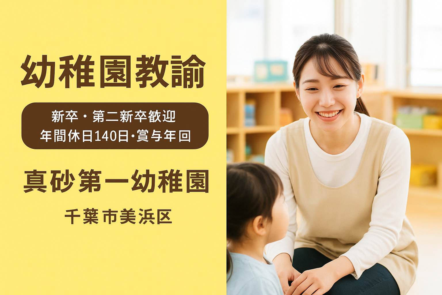 | 応募資格 | 【資格】 幼稚園教諭 有資格者(取得見込含む) 【こんな方歓迎】 ・新卒者歓迎 ・既卒や第二新卒歓迎 ・幼稚園未経験の方OK ・保育未経験の方もOK 【こんな方におすすめ!】 ・子どもが大好きで、一人ひとりの個性と成長を大切にできる方 ・明るく、元気に保育に取り組める方 ・職員間のチームワークを大切にし、協力して業務を進められる方 ・仕事もプライベートも大切にしたい方 |